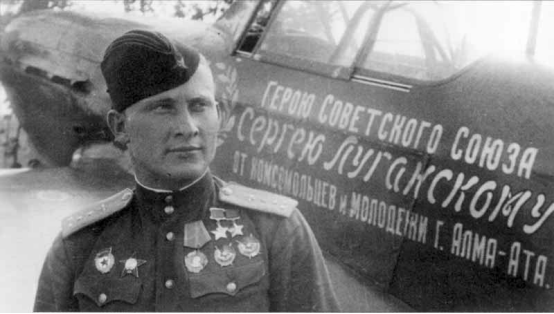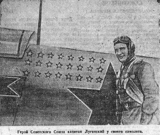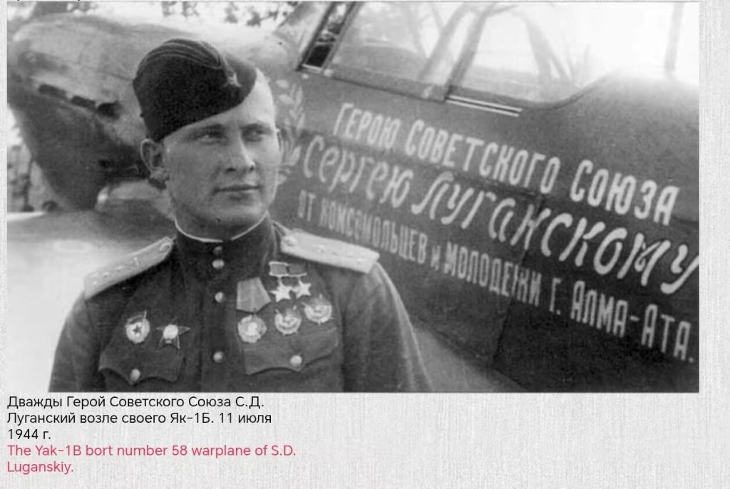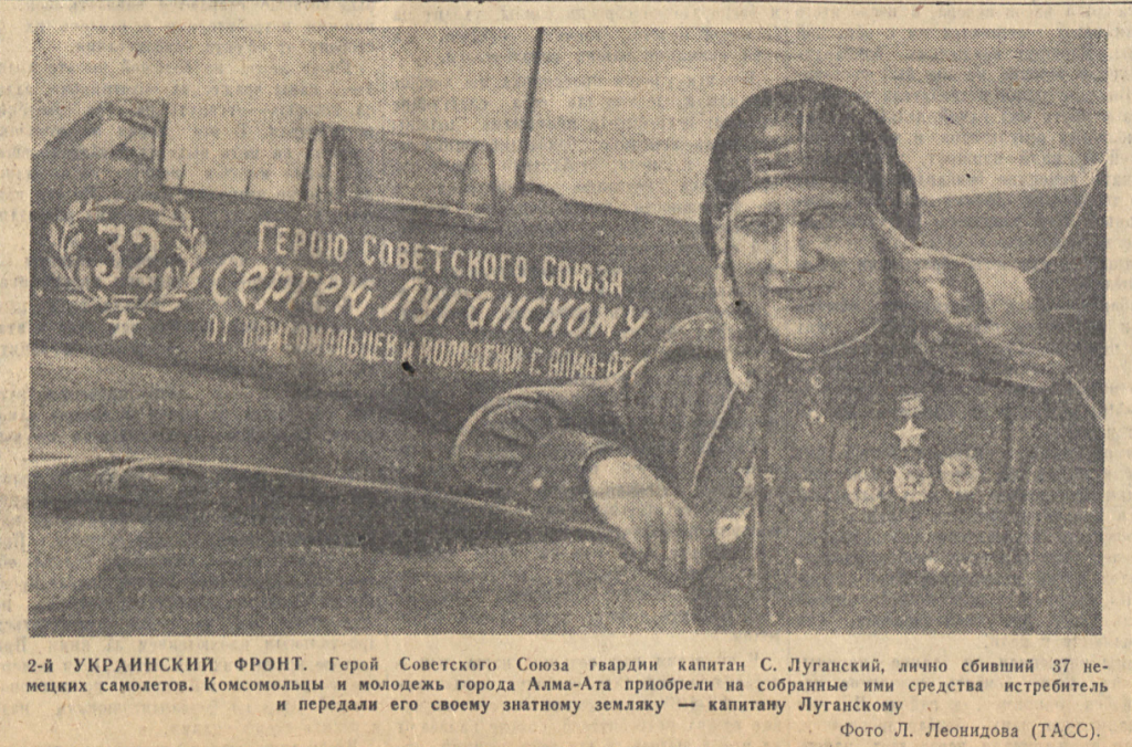 配字:“乌克兰第2方面军。苏联英雄、近卫军大尉谢尔盖·卢甘斯基(S. Lugansky),他个人已击落37架德军飞机。阿拉木图市的共青团员和青年们用募集的资金购买了一架战斗机,并将其赠送给他们著名的同乡——卢甘斯基大尉。”
