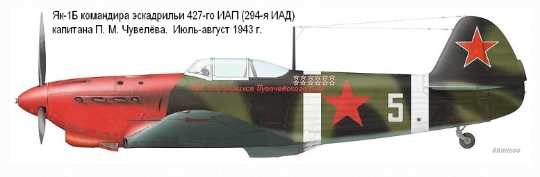 该涂装为丘韦廖夫大尉19437月至8月在第427战斗机航空团(隶属第294战斗机航空师)担任中队长的期间的座驾。机身侧面铭文为”От трудящихся Пугачёвского р-на”,意为”来自普加乔夫区的劳动者”。