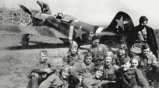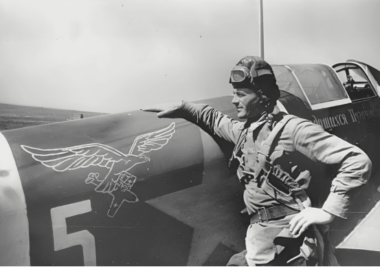 1943 年 8 月,该团飞行员站在一架 Yak-1B 战斗机前,飞机上写着“来自普加乔夫区的工人”。飞机的机头涂成红色。
