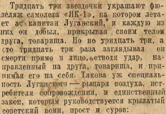 题外话:就算出现在战时报道的文字不一定全真,例如此处摘自Сталинский сокол, 1943, № 66(194)Воин из края Семи Рек(左图)一文中提到,卢甘斯基的Yak1飞机机身上有33颗红星,但根据Красная звезда, 5 сентября, 1943, № 210 (5581)中的配图(右图),实际上无论如何也数不出来33颗。