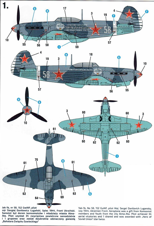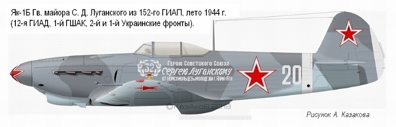Arma此处给出了他1944年夏季的座机涂装,隶属于152近卫战斗机航空团,第12近卫战斗机航空师,第1近卫地面攻击航空军,乌克兰第2和第1方面军;机身侧面铭文为”Герою Советского Союза Сергею Луганскому от комсомольцев и молодежи г. Алма-Ата”,意为”献给苏联英雄谢尔盖·卢甘斯克——来自阿拉木图市共青团员和青年。”这架飞机是由飞行员家乡(现哈萨克斯坦阿拉木图)的年轻人捐款18w卢布购买并赠送给他的。